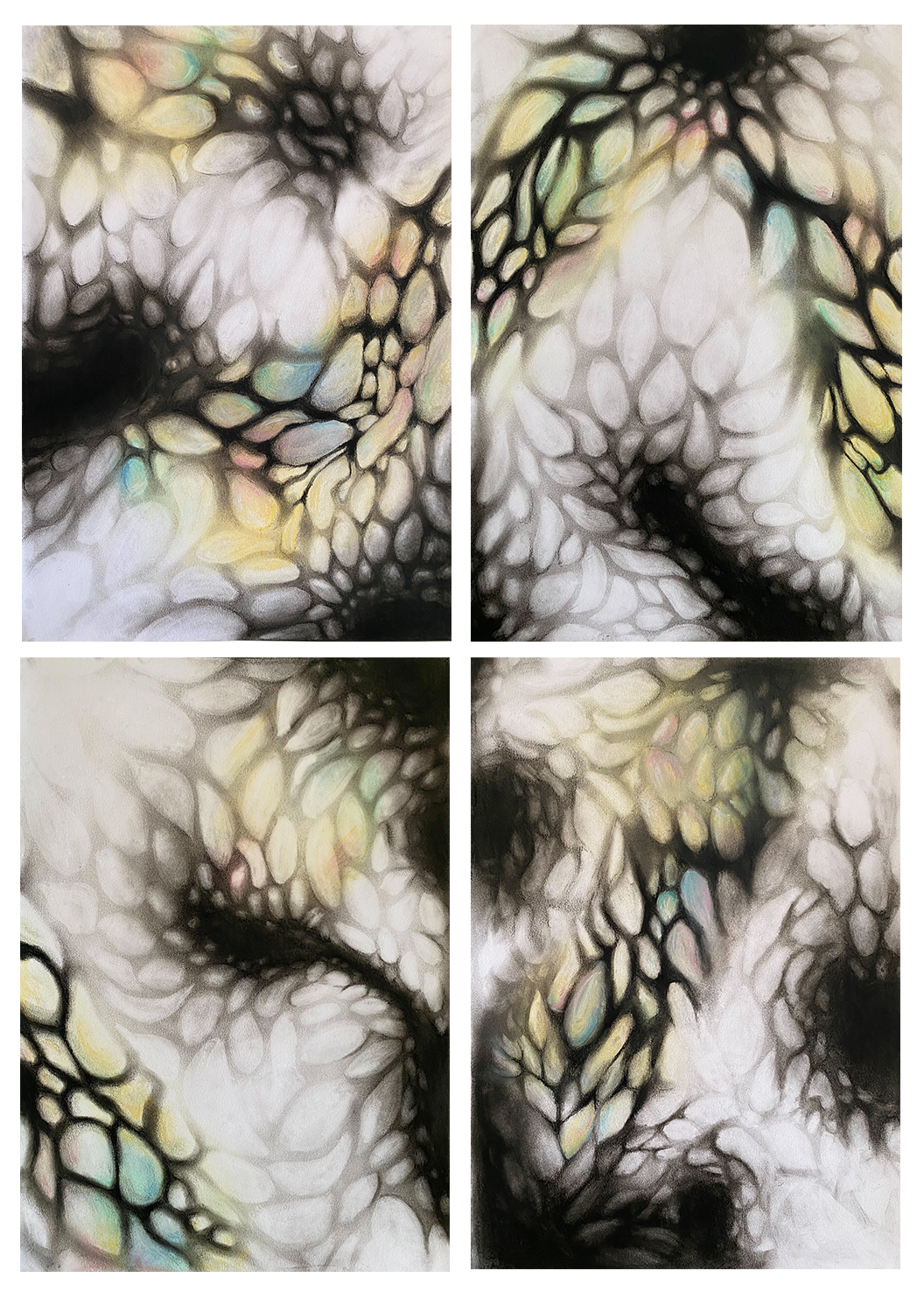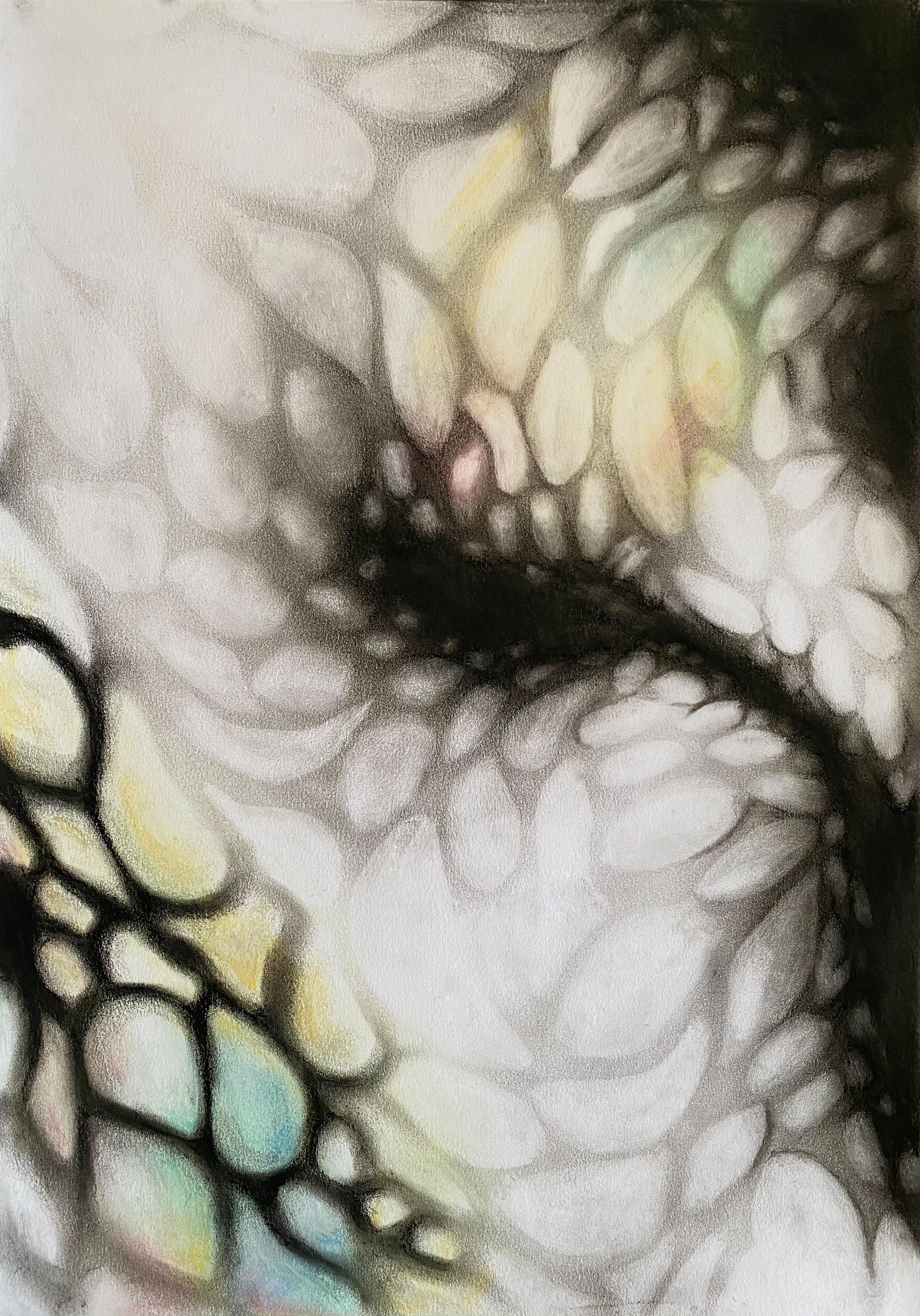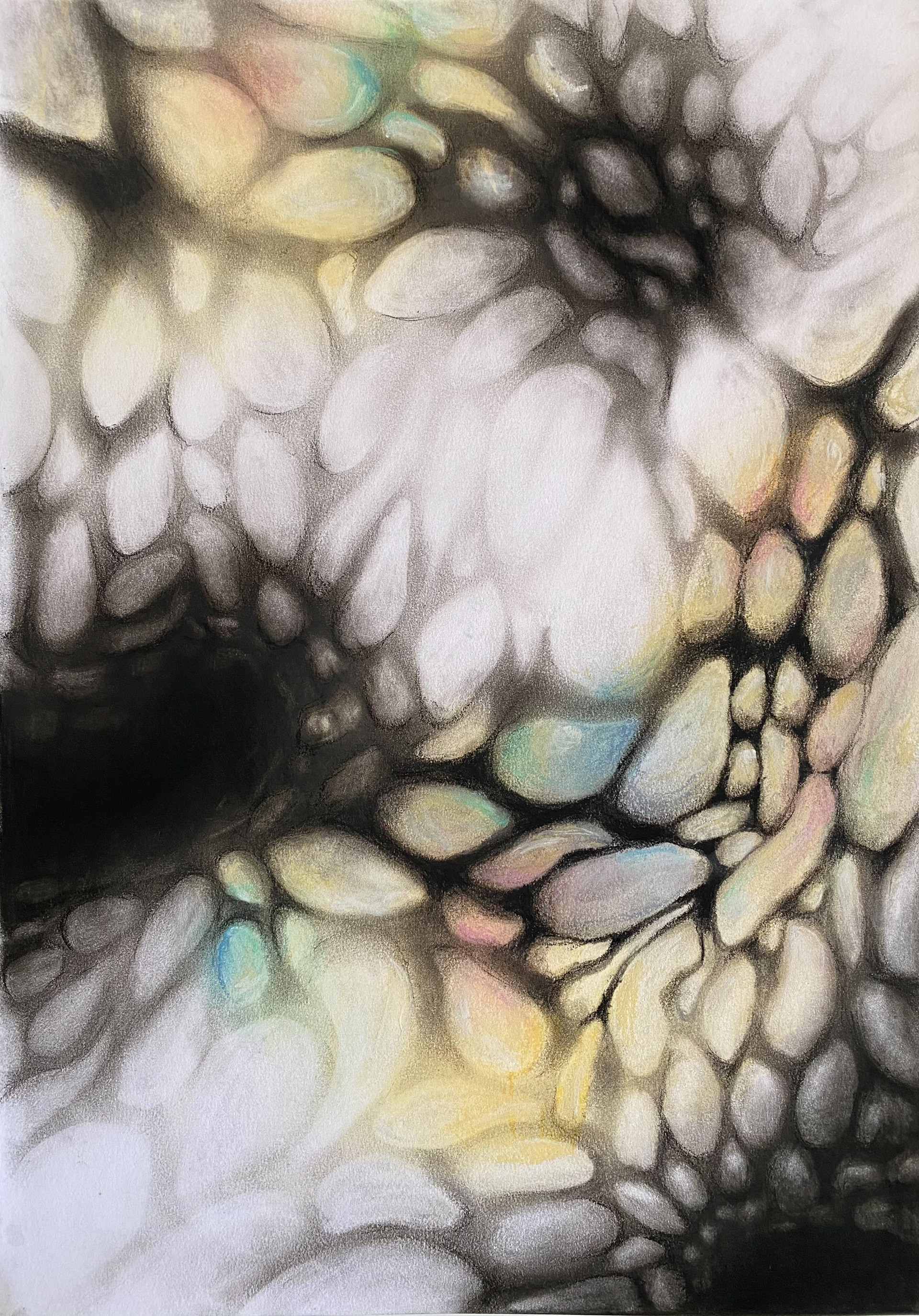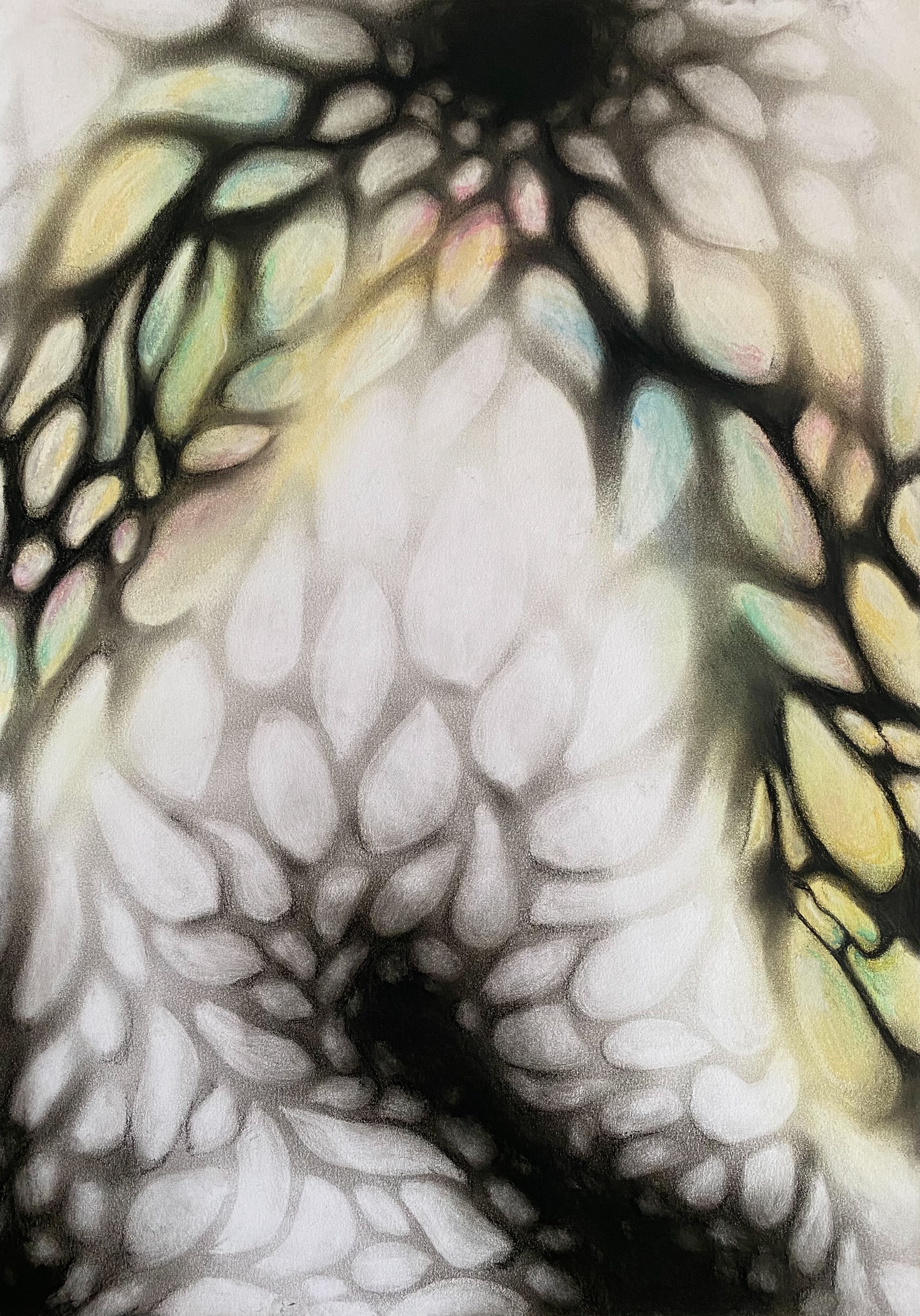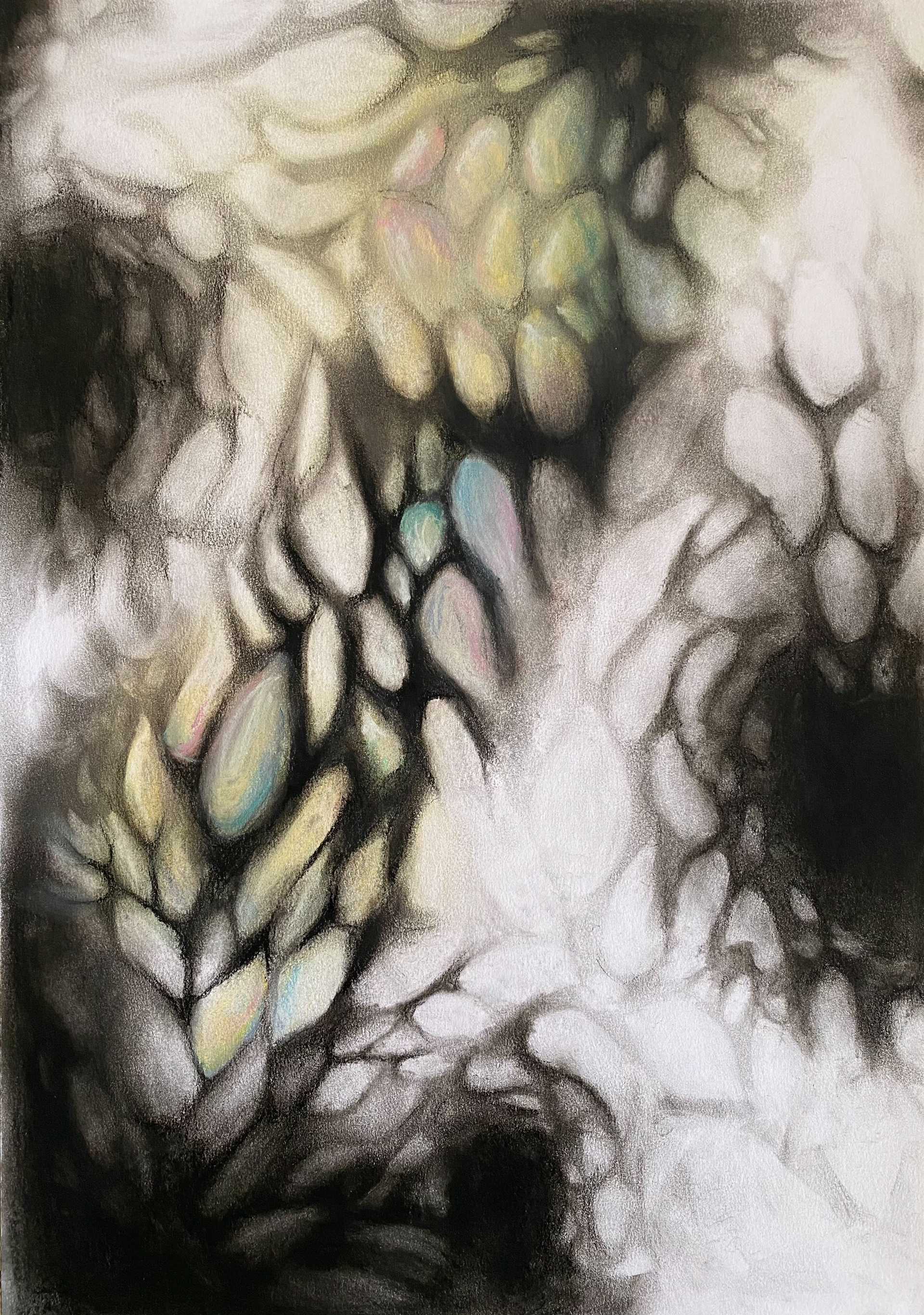 Materials: soft pastel and charcoal on paper. Dimensions: 120 x 42.5 cm