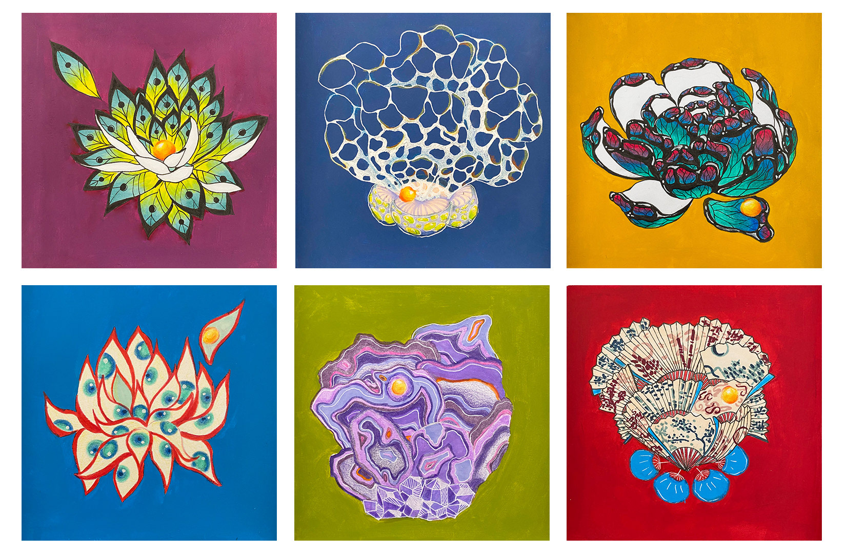 Materials: mixed media on paper. Dimensions: 13 x 13 cm each piece.